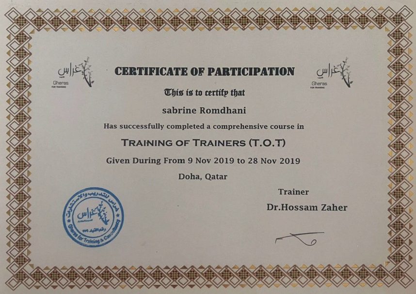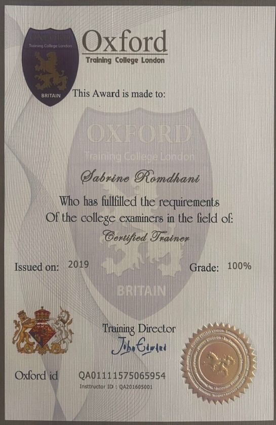 Sabrina est formatrice de formateurs, certifiée par Oxford Training College, London.